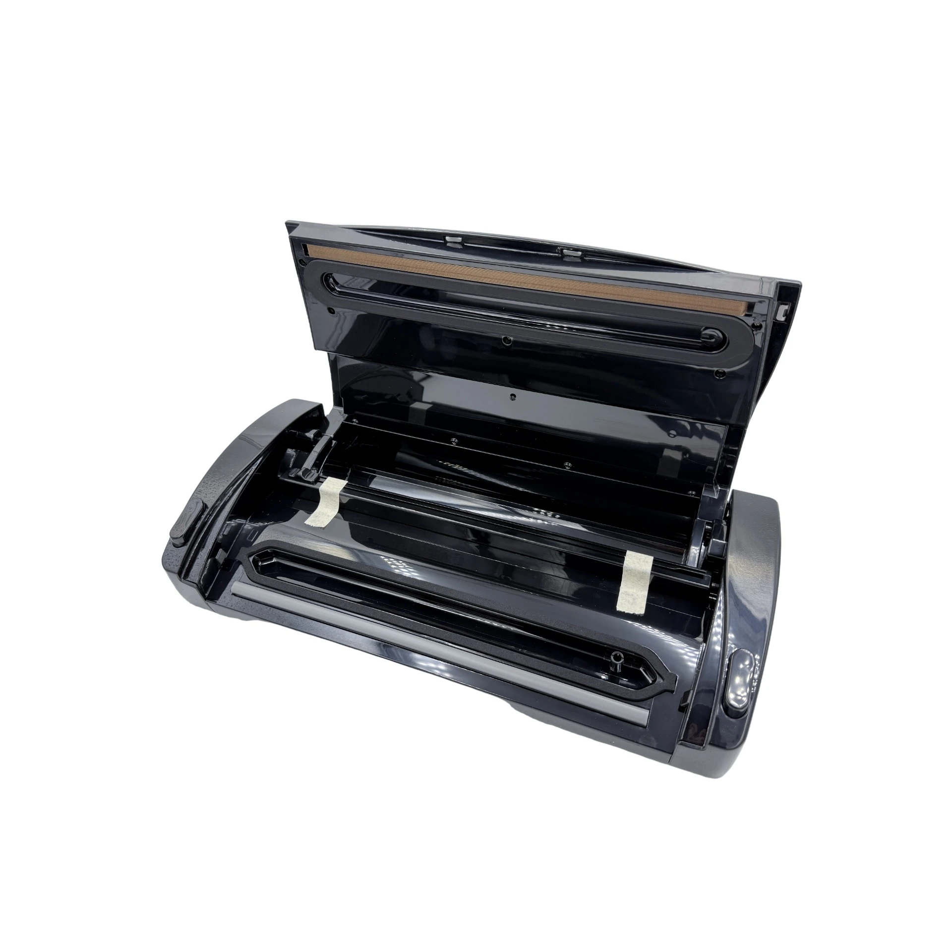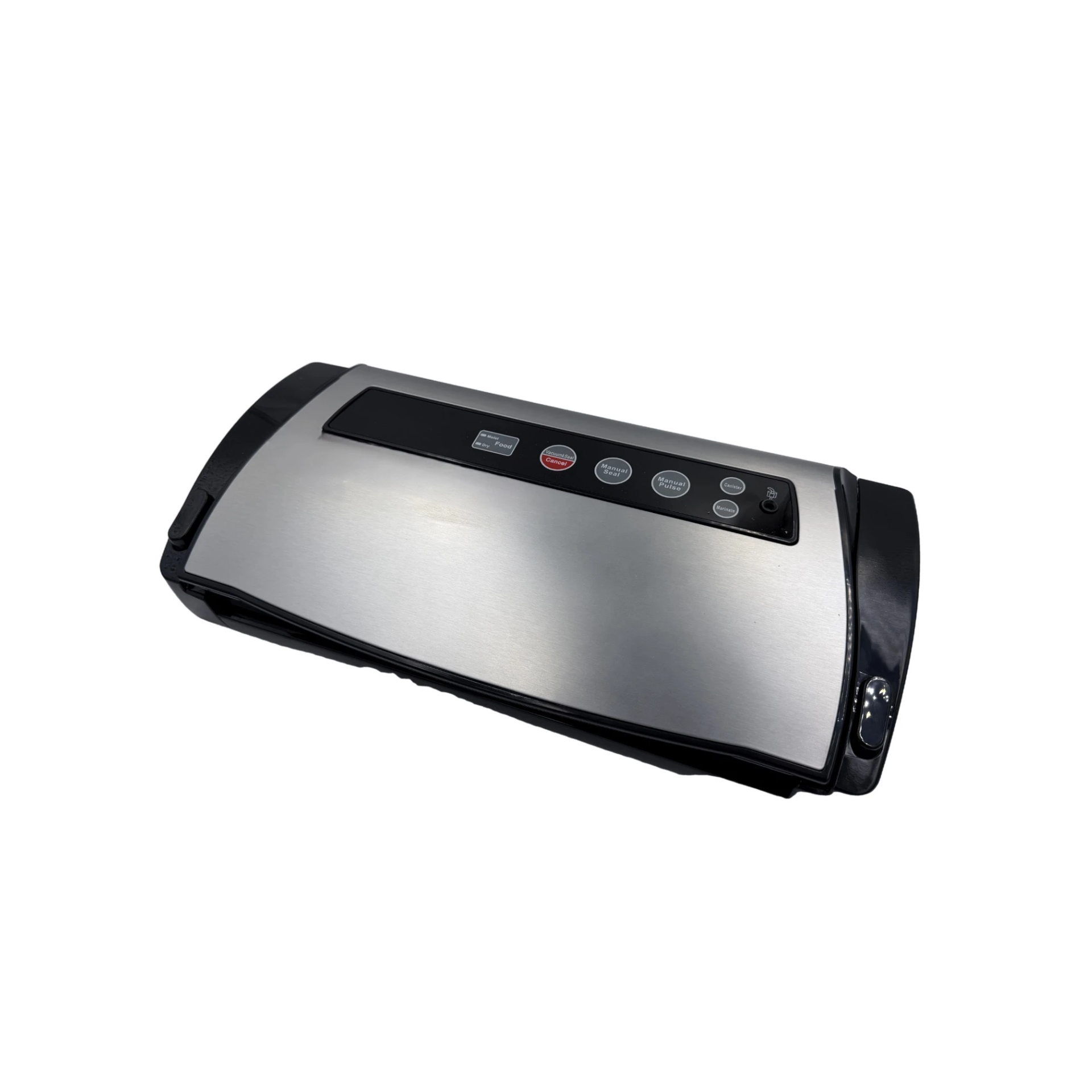Επαγγελματική μηχανή κενού αέρος με κάλυμμα από ανοξείδωτο ατσάλι, ισχυρό κινητήρα DC και αντλία εμβόλου υψηλής απόδοσης. Με ρυθμό 15 λίτρα ανά λεπτό και κενό έως -0.85 bar, προσφέρει την ισχυρότερη και γρηγορότερη σφράγιση της σειράς. Ενσωματωμένος κόφτης και αποθήκη ρολού σακούλας για άμεση ετοιμότητα.
